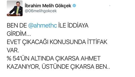 ERZURUM SEÇİMLERİ- Hürriyet Gazetesi Yazarı Ahmet Hakan 16 Nisan referandumu ile ilgili Melih Gökçek ile girdiği iddiayı kazandığını köşesinden duyurmuştu. İddia için vaad edilen takım elbiseyi istediğini söyleyen Ahmet Hakan'a henüz Gökçek tarafından dönüş yapılmadı.