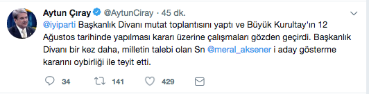 Meral Akşener'in o paylaşımından yaklaşık 15 dakika sonra Genel Başkan Yardımcısı ve Parti Sözcüsü Aytun Çıray'dan çarpıcı bir paylaşım geldi. Çıray, "İYİ Parti Başkanlık Divanı mutat toplantısını yaptı ve Büyük Kurultay'ın 12 Ağustos tarihinde yapılması kararı üzerine çalışmaları gözden geçirdi. Başkanlık Divanı bir kez daha, milletin talebi olan Sayın Meral Akşener'i aday gösterme kararını oybirliği ile teyit etti" dedi.