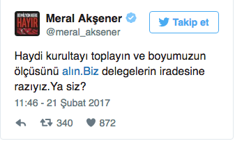 MHP'li muhaliflerin hafta sonu yaptığı toplantıyı da isim vermeden eleştiren Bahçeli'ye, genel başkan adaylarından Meral Akşener'den yanıt geldi. Akşener Bahçeli'nin konuşmasının ardından attığı tweete, "Haydi kurultayı toplayın ve boyumuzun ölçüsünü alın' dedi.İnternethaber