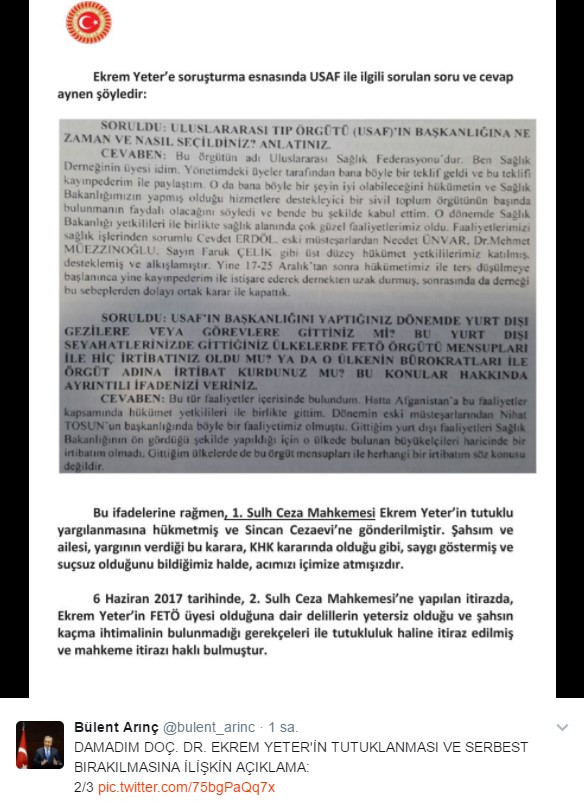 Erzurum Seçimleri- FETÖ operasyonu kapsamında tutuklanan eski Başbakan Yardımcısı Bülent Arınç’ın damadı Ekrem Yeter tahliye edildi, tepkiler arttı. Bülent Arınç tahliye olan damadı hakkında 3 sayfalık cevap verdi.