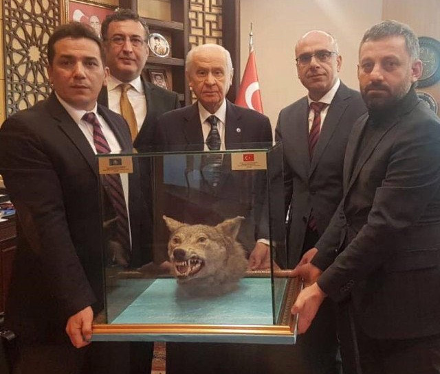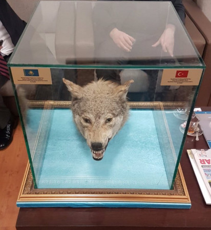 Erzurum Seçimleri/ MHP Genel Başkanı Devlet Bahçeli'ye doğum gününde Kazakistan Halter Federasyonu Onursal Başkanı Kayrat Turlıhanov tarafından doldurulmuş kurt kafası gönderildi.