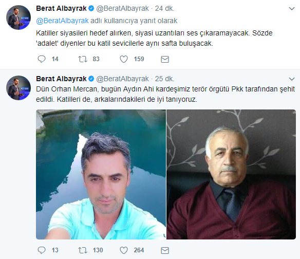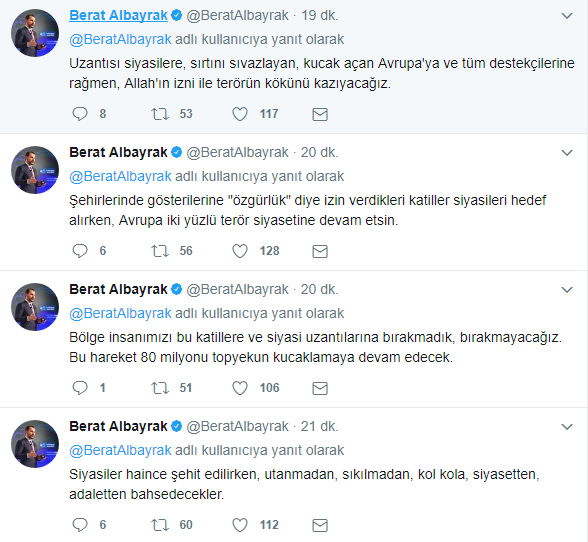 Uzantısı siyasilere, sırtını sıvazlayan, kucak açan Avrupa'ya ve tüm destekçilerine rağmen terörün kökününün kazınacağını belirten Albayrak, "Katiller siyasileri hedef alırken, siyasi uzantıları ses çıkaramayacak. Sözde 'adalet' diyenler bu katil sevicilerle aynı safta buluşacak. Siyasiler haince şehit edilirken, utanmadan, sıkılmadan, kol kola, siyasetten, adaletten bahsedecekler." açıklamasını yaptı..