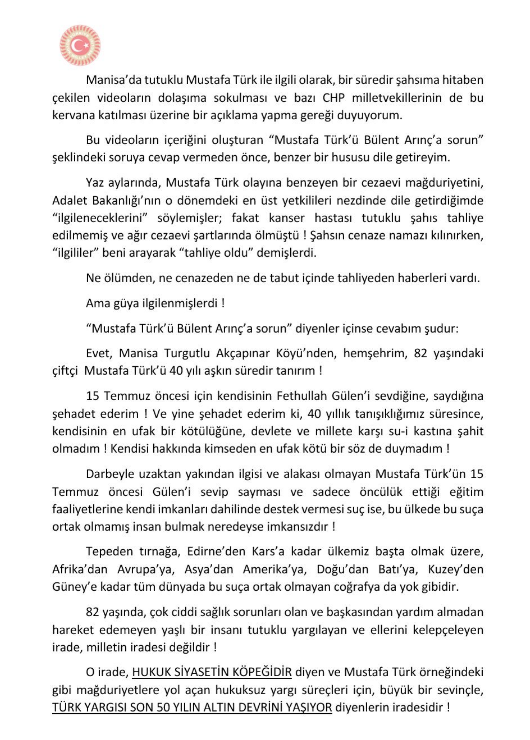 "82 yaşında, çok ciddi sağlık sorunları olan ve başkasından yardım almadan hareket edemeyen yaşlı bir insanı tutuklu yargılayan ve ellerini kelepçeleyen irade milletin iradesi değildir!" diyen Bülent Arınç, şöyle devam etti: “O irade, 'hukuk, siyasetin köpeğidir' diyen ve Mustafa Türk örneğindeki gibi mağduriyetlere yol açan hukuksuz yargı süreçleri için, büyük bir sevinçle 'Türk yargısı son 50 yılın altın devrini yaşıyor' diyenlerin iradesidir.”
