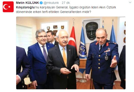 Kılıçdaroğlu'nun askeri törenle karşılanması AK Parti cephesinde ve sosyal medyada büyük tepki çekti. AK Parti milletvekili Metin Külünk, Kılıçdaroğlu'nu karşılayan komutanla ilgili de twitter'dan bir mesaj paylaşarak "Kılıçdaroğlu'nu karşılayan General, İşgalci örgütün lideri Akın Öztürk döneminde erken terfi ettirilen General'lerden midir?" dedi.