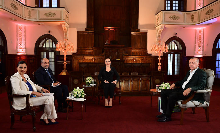 Recep Tayyip Erdoğan, Muharrem İnce'ye seslendi derslerine biraz daha çalışması gerektiğini söyledi. Kanal D ve CNN Türk'ün ortak yayınında yeni yönetim sisteminde neler olduğu konusunda önümüzdeki hafta açıklama yapacağını belirten Erdoğan, yeni sistemde bakan sayılarının azalacağını, cumhurbaşkanının daha seri olacağı ortak bir akılla süreyi hızla kullanacağı bir döneme girileceğini kaydetti. İşte Erdoğan'ın açıklamalarından satır başları: