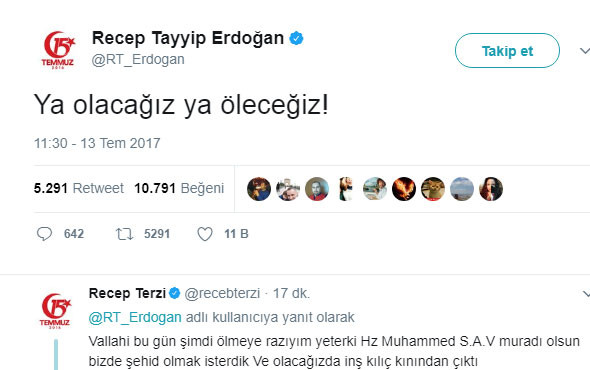 İşte Erdoğan'ın burada yaptığı konuşmada kullandığı ''Ya olacağız ya öleceğiz!'' ifadesi ilerleyen saatlerde Cumhurbaşkanı Erdoğan'ın resmi twitter hesabından da tweet olarak paylaşıldı.