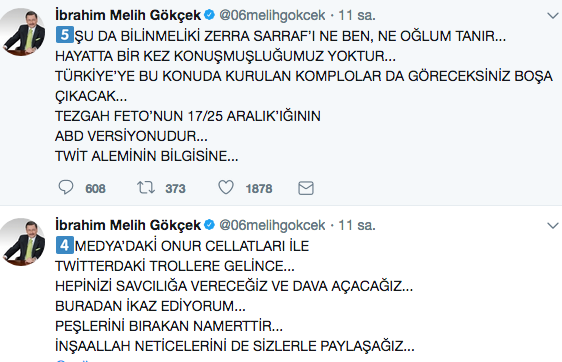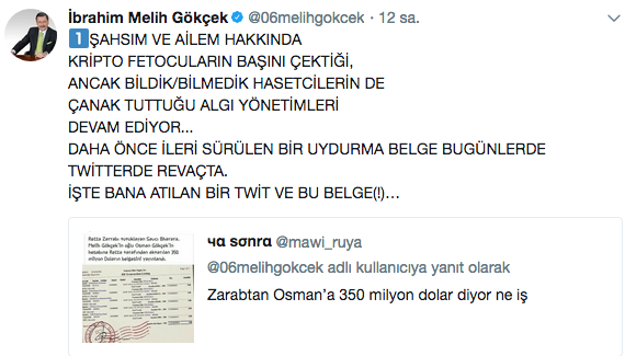 Gökçek, Twitter'da bir takipçisinin kendisine gönderdiği "Zarabtan Osman’a 350 milyon dolar diyor ne iş" tweete "Şahsım ve ailem hakkında kripto fetocuların başını çektiği, ancak bildik/bilmedik hasetçilerin de çanak tuttuğu algı yönetimi devam ediyor. Hepsini savcılığa vereceğiz buradan ikaz ediyorum, peşlerini bırakan namerttir.." tepki gösterdi. İşte Gökçek'in o tweeti: