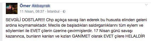 İBB'de çalıştığı öğrenilen Ömer A.'nın sosyal medya hesabından paylaştığı "17 Nisan günü savaşı kazanınca bunların karıları ve kızları ganimet olarak Evet'çilere helaldir" mesajı büyük tepki çekti.