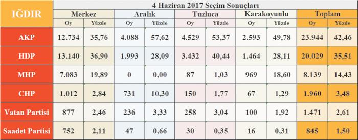Erzurum Seçimleri/ IĞDIR'da 4 Haziran 2017 Pazar günü yapılan İl Genel Meclisi seçim sonuçları ve partilerin oy dağılımı ilginç bir tabloyu ortaya koydu. HDP oyları yüzde 17 oranında düşüş gösterdi. AK Parti ise oylarını yüzde 11.49 arttırarak yüzde 42.46'ya yükseltti.