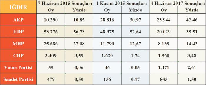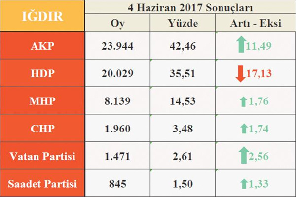 "Iğdır’da 4 Haziran 2017 günü yapılan İl Genel Meclisi seçimi, Türkiye’nin yaşadığı süreçle ilgili ipuçları veriyor. Seçime katılan altı partinin oy sıralaması ve aldıkları oylar şöyle: