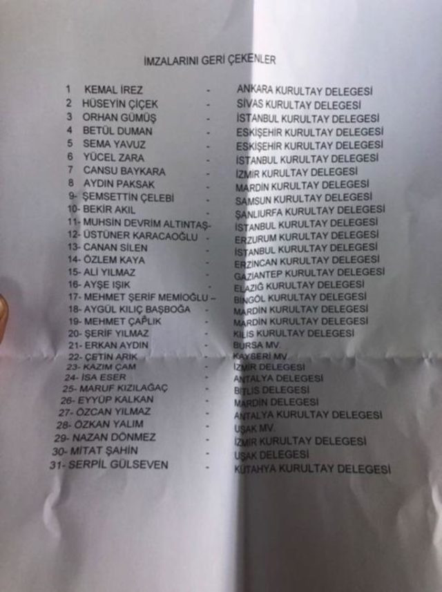 Yurt gazetesinin haberine göre imzasını geri çeken 31 delegenin isimleri şöyle: