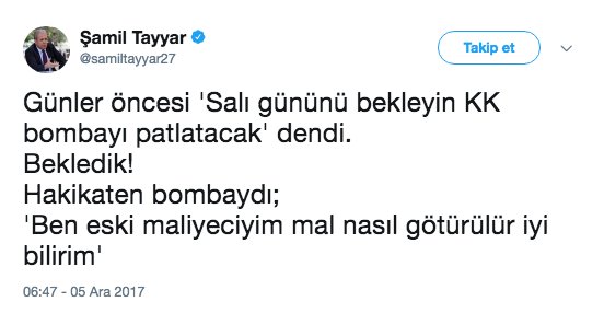 Kılıçdaroğlu'nun bu konuşmasının ardından AK Parti Gaziantep Milletvekili Şamil Tayyar tweet attı. Kılıçdaroğlu'nun "Ben eski maliyeciyim mal nasıl götürülür iyi bilirim" sözlerini hatırlatan Tayyar, "Günler öncesi 'Salı gününü bekleyin KK bombayı patlatacak' dendi. Bekledik! Hakikaten bombaydı; 'Ben eski maliyeciyim mal nasıl götürülür iyi bilirim' " dedi.