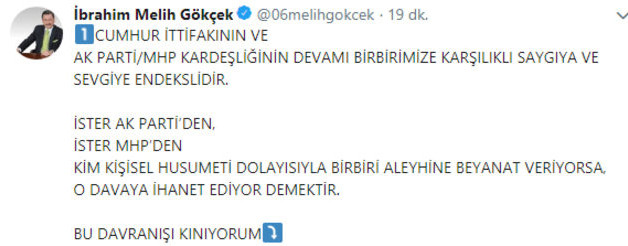 AK Parti ile MHP arasında yaşanan WhatsApp olayıyla ilgili Twitter hesabından yorumda bulunan Eski Ankara Büyükşehir Belediye Başkanı Melih Gökçek, çok konuşulacak ifadeler kullandı.