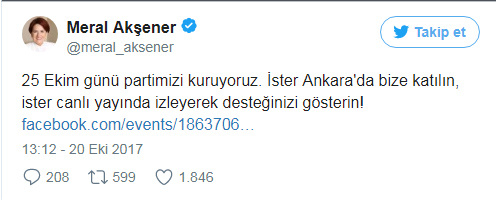 Sosyal medyadan yaptığı paylaşımda, ''25 Ekim günü partimizi kuruyoruz. İster Ankara'da bize katılın, ister canlı yayında izleyerek desteğinizi gösterin. Yüreği bizimle olan herkesi bekliyoruz'' dedi. Akşener yeni partisini Ankara Nazım Hikmet Kültür Merkezi'nde ilan edecek. Akşener'in yeni partisini ilan edeceği yer ise dikkat çekici.