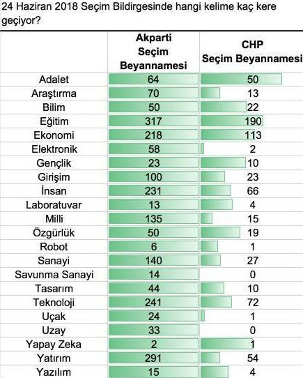 İki partinin 24 Haziran 2018 seçim bildirgelerinde eğitim, ekonomi, teknoloji, yatırım, sanayi, milli, savunma sanayi, insan, araştırma ve girişim kelimelerinin kullanılma sıklığı AK Parti'nin CHP'ye oranla kat kat daha özverili ve vizyonlu olduğunu ortaya koyuyor.