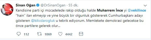 CHP'nin cumhurbaşkanı adayının Muharrem İnce olmasının ardından MHP’den ihraç edilen Sinan Oğan, sosyal medya hesabı Twitter'dan yorumda bulundu.