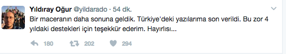 Yıldıray Oğur, 'Bir maceranın daha sonuna geldik. Türkiye'deki yazılarıma son verildi. Bu zor 4 yıldaki destekleri için teşekkür ederim" notunu yazdı.
