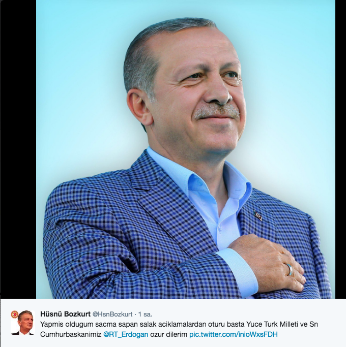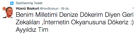 Bugün de Hüsnü Bozkurt'un hesabı kendilerine 'AYYILDIZ TİM' diyen hackerlar tarafından hacklendi. Bozkurt'un hesabından, ''Yapmış olduğum saçma sapan açıklamalardan oötürü başta yüce Tük milleti ve Cumhurbaşkanımızdan özür dilerim' mesajı paylaşıldı